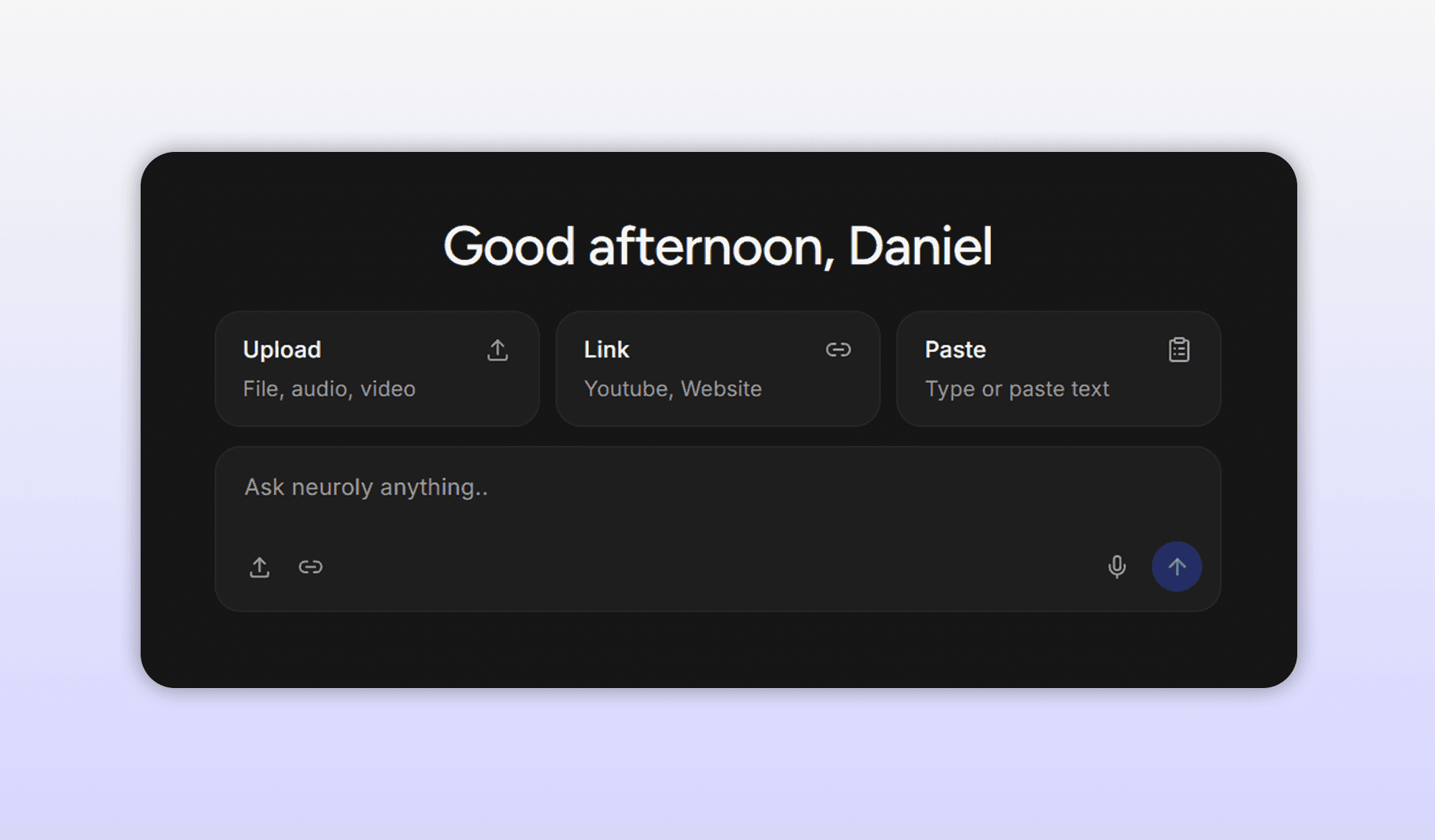 Upload your notes, slides, PDFs, Youtube videos, or website links into Neuroly.