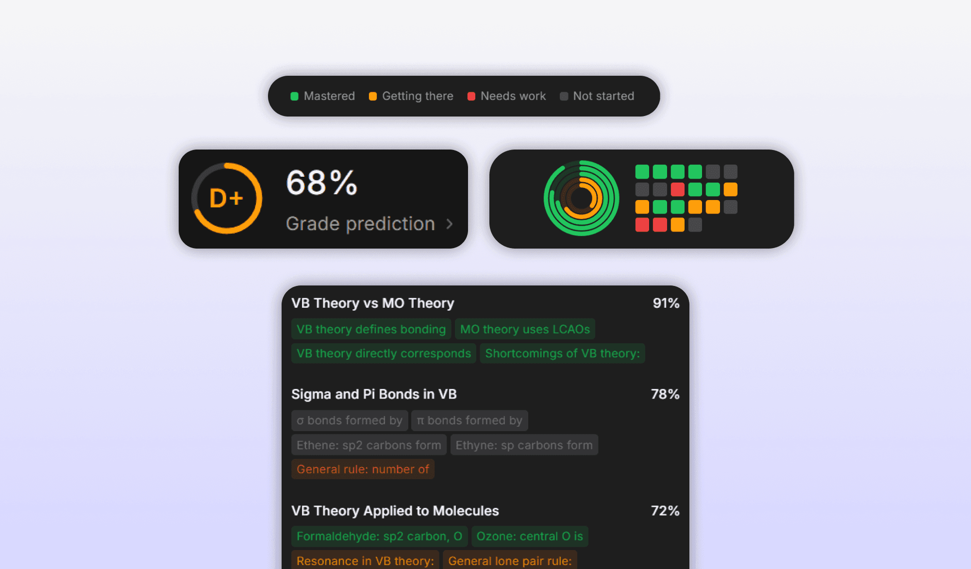 Neuroly tracks your weak spots, progress, and predicted exam score.
